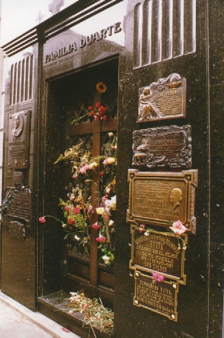 En 1972, Perón regresó a Argentina, pero prefirió dejar el cuerpo de Eva en Madrid. Luego en 1973 fue nuevamente elegido presidente, con Isabel como vicepresidente. Su mandato fue breve: murió en 1974. Isabel se convirtió en presidente y ordenó que el cadáver de Eva fuera trasladado a su patria. Miles de argentinos se alinearon, llorando, a lo largo de la ruta que une el aeropuerto internacional de Ezeiza con la ciudad de Buenos Aires, para recibir a su amada Evita. El cuerpo fue de nuevo expuesto en una capilla ardiente, esta vez al lado del féretro de Juan Perón. El cuerpo de Perón había sido sepultado poco después de su velatorio, pero el de Eva fue a parar nuevamente a un depósito. Isabel fue derrocada, y recién en Octubre de 1976 la junta militar decidió depositar el cadáver de Eva en el cementerio de la Recoleta. Su última morada se construyó como la cámara acorazada de un banco, a fin de disuadir a cualquiera que tratase de apoderarse del cadáver Texto: Susana Espósito - Fotos: Luis Leoz |